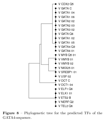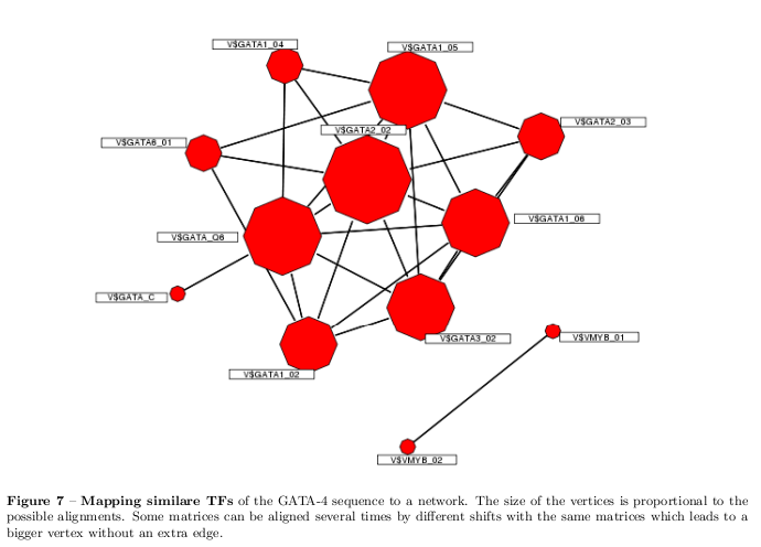 The analysed sequences show a great statistical divergence from random sequences which has been shown in several statistical tests as the \( \chi^2 \) test of mutual information. Also the first dinucleotide statistic shows strong deviation from the random model which actually can be used to predict motifs within the sequences. This reason makes it crucial to choose a better background model than a random one. Specially to respect the higher CpG content of motifs a markov model has been chosen to generate a background of 1000 randomised sequences per sequence for the following TFBS prediction. The initial list of TFs binding the sequences has been several hundred TFs long. Bearing in mind that most of the PWMs have a low information content, the list was reduced to TFs with high complexity with the help of the background model. The choice of the background model shows a determining effect on the finally predicted TFs which is shown in figure 6. The final list of predicted TFs is assumed to contain TFs with very similar binding behaviour. By arranging similar TFs to a network it has been shown that the predicted TFs cluster with the motifs in the sequence. (q.v. figure 7) This clusters can be arranged to family binding profiles by a multiple alignment of the individual PWMs which has been shown for the GATA binding motif in figure 9. The results of this analysis are in agreement with the motifs placed into the sequences. The choice of the background model and the used thresholds for rejecting TFs are crucial and have a strong impact on the rate of false-positives and false-negatives. The used values have been confirmed to perform best by many meta studies and are chosen for further analysis.