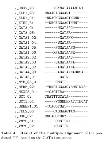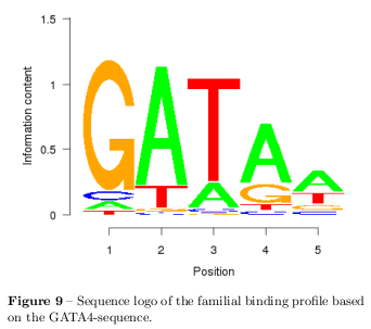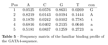 The frequency matrix of the aligned binding profiles predicted by MATCH on the GATA4-sequence is shown in table 5 and the resulting sequence logo is shown in figure 9.