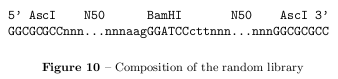 The library consists of twice 50bp random sequences and a 5'-flanking region with a AscI restriction site and a palindromic 3'-flanking region containing a BamHI restriction site.