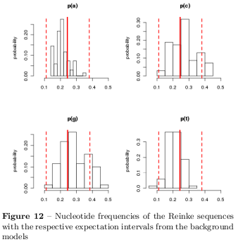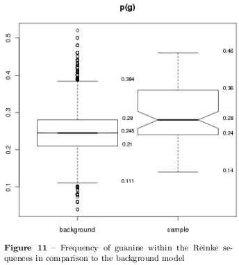 Because there have been no known motifs from the TRANSFAC database been found within the flanking regions, the sequences have been adjust and redundancy removed. To unify the data all the probes have been renamed with the number of the random sequences presented in the Supplemental~Table~1 in the Reinke et al. paper [19], whereat the \( N50 \) at the \( 5' \)-end is called "-1" and the second \( N50 \) sequence close to the \( 3' \)-end is called "-2". With one exception, probe 82 from the Reinke data could not be aligned with the sequences presented in the Supplementary Table 1 and is called UNKNOWN. In case the circadian binding activity could not be narrowed to one of the random sequences the entire plasmid sequence is used and can be recognised at numbers without a specifying suffix. A Monte-Carlo background model with 1000 random sequences of the same length has been used to define the expectation interval of 95% of nucleotide frequency in random sequences and finally significant frequencies have been characterised (with \( p<0.05 \) ). Figure 11 shows the data for the guanine frequency within the Reinke sequences and the background model and it is evidence that the frequencies within the Reinke sequences differ from the background model.