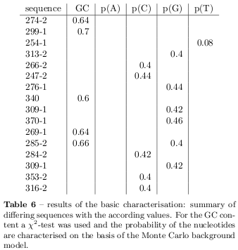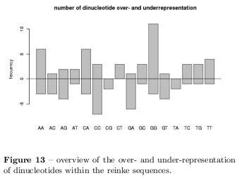 In figure 12 it can be realised that specially the GC content of the sequences should be demonstrative and in order to characterise the GC content a \( \chi^2 \) test was used to distinguish sequences which differ significant with \( p<0.05 \) what is the case for 5 sequences. Table 6 shows the summarised results of the characterisation based on the Monte Carlo background. The sequences differ primarily in their GC content. Surprisingly, not even one of the sequences shows any irregularities in their CpG dinucleotide statistics as introduced before. Figure 13 summarises the results of the dinucleotide statistics where positive frequencies represent the number of sequences with overrepresented dinucleotides and negative frequencies represent under-representation. Specially the GpG dinucleotide is very often overrepresented and CpC dinucleotides are specially underrepresented. To find PolyA stretches a window of different sizes has been slided over the sequences scoring possible stretches whereat the following stretches has been found: