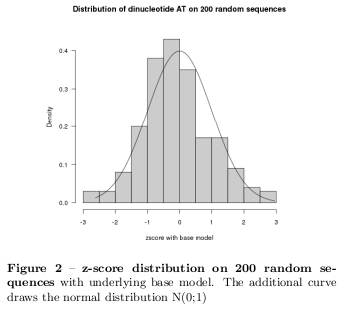 using the seqinR package [5] with the base model. Figure 2 shows a \( z_\mbox{score} \) distribution on 200 random sequences and the corresponding normal distribution. With this underlying model z-scores have been calculated on the given sequences. For instance, Figure 1 shows the results for the E2F-sequence with great variations in various dinucleotides as CpG, GcP, TpT, ApA, TpA, and further ones. Clearly, the type of the sequences causes this deviation from the equipartition. The results of the remaining sequences are in the supplementary material.