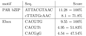 The results of sequence 98-1 are very interesting: With HLF and the avian TEF ortholog VBP are truly PAR-bZip motifs predicted as by Reinke et al. But beside of the PAR-bZip motif a CEBP motif is predicted and the best scoring E4BP4 TF has a known antagonistic role in the circadian oscillatory mechanism 16] and does not cluster with any other predicted TF of this sequence.