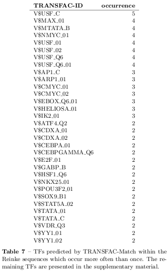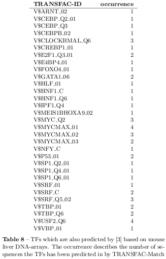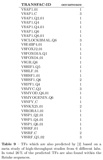 Table 7 shows the most frequently predicted TFBSs. The binding motif USF_C is very similar to the other USF motifs and correlates also with several other Ebox motifs such as CLOCKBMAL, EBOX and MYCMAX. The USF motifs does not match any known transcription factor but the similarity analysis classifies them as a Ebox motif. In summary most of the most frequently predicted TFBSs are Ebox motifs which is in agreement with the results by Reinke et al.