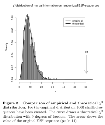 To measure the divergence of the sequences from a statistically independent random sequence the mutual information equation [18] has been used: \[ I = \sum_{i;j=1}^\lambda p_{ij} \log_2\frac{p_{ij}}{p_i\times p_j} \] The Taylor expansion the equation leads to a \( \chi^2 \) distributed variable: \[ \hat{I} \approx \frac{1}{2\log_e2} \sum_{i;j=1}^\lambda \frac{(p_{ij}-p_ip_j)^2}{p_ip_j} \] According to John Hawks Web-Blog [10] the significance of mutual information is tested with a Pearson's \( \chi^2 \) test and 9 degrees of freedom: There are 3 independent bases which leads to 9 independent dinucleotides. In a statistically independent random sequence a base provides no mutual information about other bases which leads to a mutual information content of \( I = 0 \). This is however an unrealistic claim for empirical random sequences and the equation already shows a statistically distributed variable. Therefore, a set of 1000 shuffled sequences has been created to calculate a empirical distribution of the test variable and compare this with the theoretical \( \chi^2 \) distribution. The normalization of the empirical distribution is given by: \[ 2n \log_e 2 \] where \( n \) is the number of cases in the sample. [10]