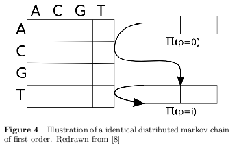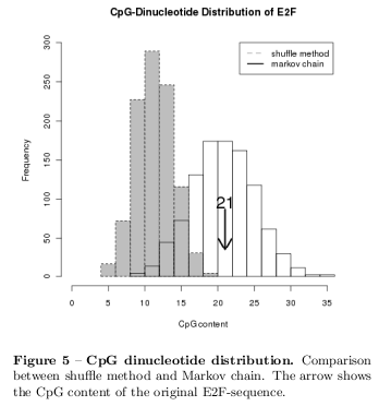Obviously, the results show that a simple shuffle method which assumes statistically independence would distort the statistically characteristics of the two letter words distribution in the simulated background such as the overrepresented GC content of the E2F-sequence. For this reason, a Markov chain of first order with a one step transition matrix has been used to simulate a background with the same two letter words statistic as the foreground. [8] A markov chain of first order uses initial probability distribution and a one step transition matrix to derive the probabilities for the following bases based on the further one. For representing two letter words a markov chain of first order is needed.