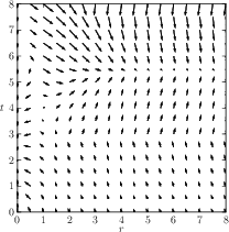 The fitness of an individual is described by the payoff function \( Z_i \) (eq:2.1) and depends on its strategy \( (r_i, t_i) \) and on the composition of the population due to the generalisation of aversive information based on similarity. We consider invasion of a mutant group into a monomorphic resident population, i.e. all members of the resident population play an identical strategy. We will refer to the resident population with subscript \( 1 \) and to the mutants with subscript \( 2 \). Mutants can differ from residents in either of the two strategy components, and we consider the selective pressure in two different directions, one in each component. In each component we consider the payoff of mutants of different types \( x_2 \) against the resident population \( x_1 \), indicated by the payoff function \( Z(x_2,x_1) \). The selective pressure is defined by the derivative of the payoff function \( Z \) with respect to \( x_2 \) (strictly this derivative does not exist in the direction of \( r \) but the expression below is still meaningful as we discuss in Section 3.2), which is visualised as a gradient \( \nabla Z \) over a grid of points using a numerical 5 point stencil approximation of each partial derivative separately with \( h=1e-5 \) as follows: \[ \partial Z = \frac{-Z(x_1+2h,x_1) + 8Z(x_1+h,x_1) -8Z(x_1-h,x_1) + Z(x_1-2h,x_1)}{12h} ~~. ~~~~(2.2) \]