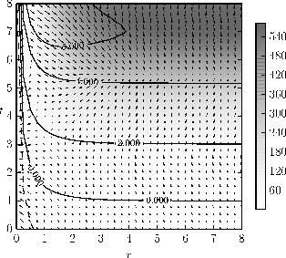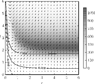 The population composition is defined by the values of the population size ( \( N \) ) and the mutant group fraction ( \( a \) ). The final visualisation shows the gradient of the payoff function \( \nabla Z \) as a vector field (Fig. 1a) representing the selective pressure, the fitness value of an individual in a homogeneous population in the background as a heat map (Fig.1b), and the behaviour of \( D(r)Q(I) \) as a contour plot (Fig. 1c). The product \( DQ \) can in principle increase, decrease or remain constant according to the choice of functions. It has been discussed that biologically meaningful functions should result in an increasing or only slowly decreasing product \( DQ \) with increasing signal strength \( r \) in homogeneous resident populations [Broom 2006]. Therefore, we require \( dDQ/dD > 0 \) with \( DQ=D(exp(-AD) + q_{min}) \) and from \[ \frac{d}{dD} DQ = \exp (-AD) - AD \exp (-AD) + q_{min} ~~~~(2.3) \] we have \( A<(1+q_{min}\exp(AD))/D \) where \( A=Nq_0H(t)/\epsilon \).