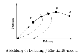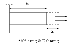 \( \Delta l = l - l_0 \) Die Dehnung ist wie folgt charakterisiert: \( \epsilon = \frac{\Delta l}{l}\) Die Spannung gibt die Fähigkeit an, einer Kraft \( F \) im Verhältnis zur Fläche \( A \) zu widerstehen:\newline \( \sigma = \frac{F}{A} \ [Nm^{-2}] \) Wird ein Körper durch Dehnung deformiert, dann ergibt sich folgender Zusammenhang:
