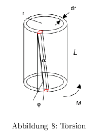 \[ \begin{align} \sigma &= \frac{dF}{dA}= Y * \alpha = Y \frac{r*\phi}{L} \\ dA &= 2\pi\,r\,dr \\ dF &= dA * Y*\frac{r*\phi}{L} \\ &= 2\pi\,r^2\,dr\,Y\,\frac{\phi}{L} \\ & \text{Das Drehmoment} \\ dM &= dF*r = 2\pi\,r^3\,dr\,Y\,\frac{\phi}{L} \\ & \text{durch Integration} \\ M &= \underbrace{\frac{\pi * Y}{2\,L}r^4}_{D_{tors}=Torsionssteifigkeit} *\,\phi = D_{tors}*\phi \end{align} \]