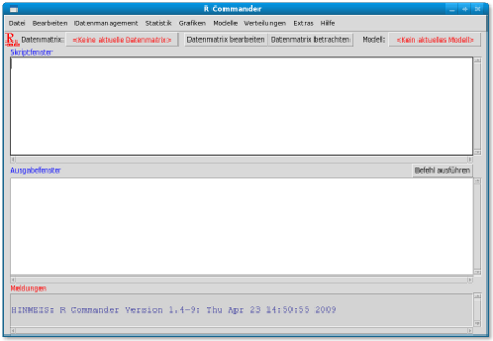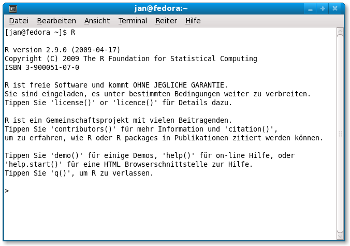 Für R existieren auch verschiedene grafische Benutzeroberflächen, jedoch ist R vorwiegend eine Programmiersprache und spielt erst hier ihre wahren Stärken aus. Aber gerade als Anfänger fühlt man sich in einer GUI sicherer, vor allem, wenn man die Befehle noch nicht kennt. Eine GUI ist zum Beispiel Rcmdr. Um die Oberfläche Rcmdr zu verwenden, müssen Sie im Terminal eine interaktive R-Konsole starten. Geben Sie dann am Eingabeprompt von R folgenden Befehl ein: