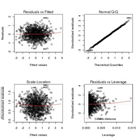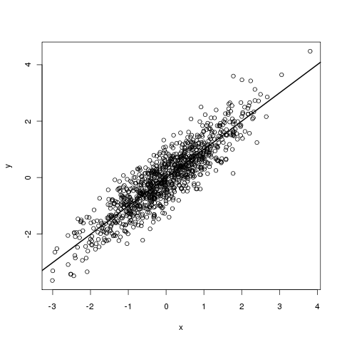 Call: lm(formula = y ~ x) Residuals: Min 1Q Median 3Q Max -1.624218 -0.335981 -0.006877 0.377696 1.822160 Coefficients: Estimate Std. Error t value Pr(>|t|) (Intercept) -0.008093 0.016452 -0.492 0.623 x 1.003216 0.015904 63.078 <2e-16 *** --- Signif. codes: 0 ‘***’ 0.001 ‘**’ 0.01 ‘*’ 0.05 ‘.’ 0.1 ‘ ’ 1 Residual standard error: 0.5202 on 998 degrees of freedom Multiple R-squared: 0.7995, Adjusted R-squared: 0.7993 F-statistic: 3979 on 1 and 998 DF, p-value: < 2.2e-16Es wird eine Zusammenfassung zur Verteilung der Residuen angegeben. Außerdem wird die Signifikanz der geschätzten Koeffizienten ausgegeben inklusive verschiedener Fehlerwerte für die Güte der Regression.