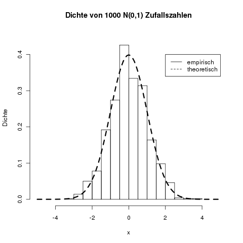 > set.seed(1) # Reproduzieren von Zufallszahlen > x <- rnorm(1000) # Ziehen von 1000 standardnormalverteilten # Zufallszahlen # Histogramm mit theoretischer Dichtefunktion und Legende > hist(x, main="Dichte von 1000 N(0,1) Zufallszahlen", freq=FALSE, + ylab="Dichte", xlim=c(-5, 5), ylim=c(0, 0.45)) > curve(dnorm, from=-5, to=5, add=TRUE, lty=2, lwd=3) > legend(2, 0.4, legend=c("empirisch", "theoretisch"), lty=c(1,2)) > qqnorm(x) # Ein QQ-Plot > qqline(x, lwd=2, col="red") # Eine rote Linie für die ideale # Normalverteilung # Beispiel für Regression > y <- x + rnorm(x, sd=0.5) # Rauschen auf der y-Variablen > plot(x,y) > reg <- lm(y ~ x) # lineare Regression und speichern in reg > summary(reg) # Zusammenfassung der Regression > abline(reg, lwd=2) # einzeichnen der Regression > par(mfrow=c(2,2)) # Grafik in 2x2 Subplots unterteilen > plot(reg) # 4 verschiedene Plots zur Regression