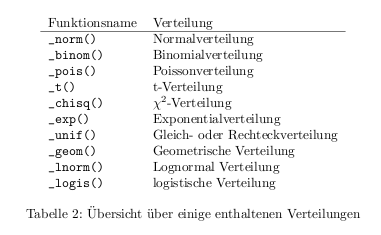 R besitzt als Programmiersprache für Statistik natürlich sämtliche Verteilungen als festen Bestandteil der Sprache. Dabei gibt es immer eine Funktion für die entsprechende Verteilung, welcher ein Buchstabe vorangestellt werden muss, je nachdem, was man benötigt: